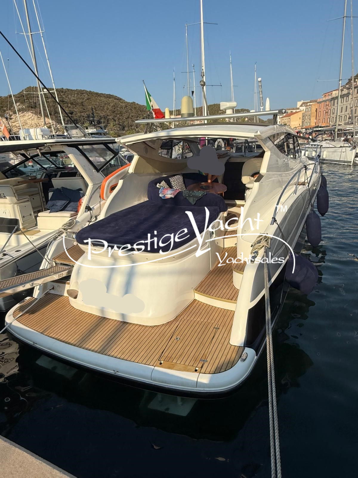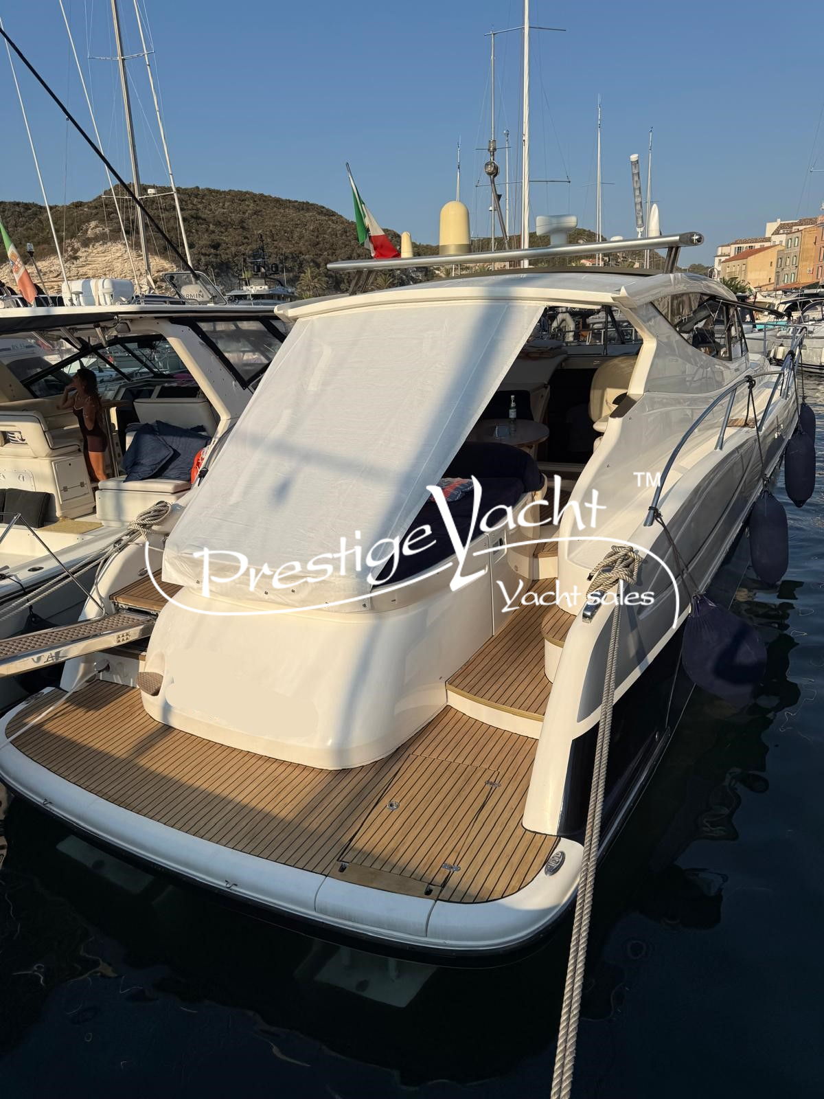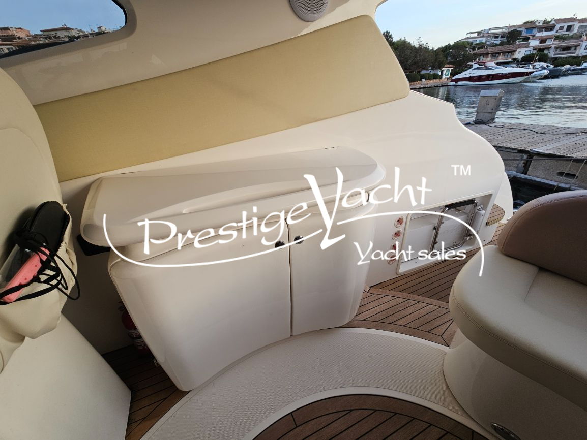 Allarme motore, Autoclave, Caricabatterie, Doccia esterna, Elica di prua, Faro orientabile, Flap idraulici, Hard Top, Impianto antincendio, Luci di cortesia, Passerella (idraulica), Piattaforma, 2 Pompa di sentina automatica, Porta di ingresso, Pozzetto in teak, Presa 220V banchina, Rollbar, Salpa ancora elettrico, Scaletta da bagno, Tavolo in pozzetto, Tender (+fb Mercury)