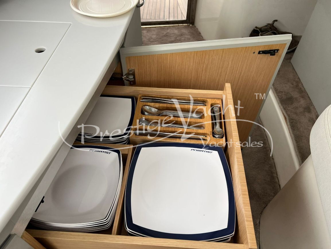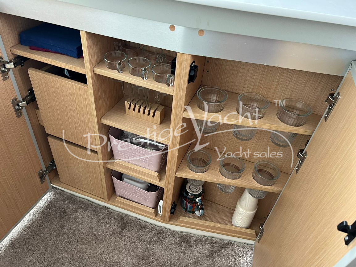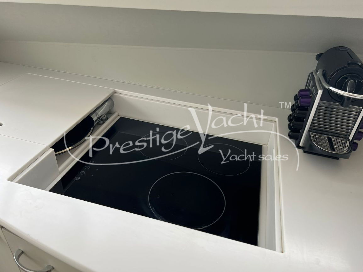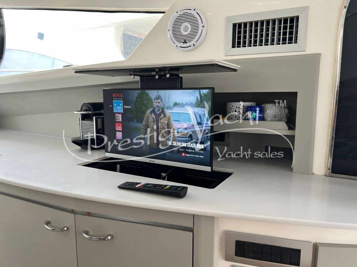 Carga baterías, Luces subacuáticas, Alarma motor, Autoclave, Balsa salvavidas, Baterías, 3 Bomba de sentina automática, Bomba de sentina eléctrica, Bomba de sentina manual, Cubierta Teak, Ducha externa, Escalera de baño, Faro orientable, Flap hidráulico, Garage para tender, Hard Top, Hélice de proa, Indicador Flaps, Instalación antiincendio, Lava cadenas, Luces de cortesía, Mesa de bañera, Molinete eléctrico, Pasarela (hidráulica retráctil), Pasillos laterales en teca, Plataforma, Puerta de entrada, Rollbar, Tender (+Facebook), Toma agua directa de puerto, Toma directa de puerto, Winch de popa